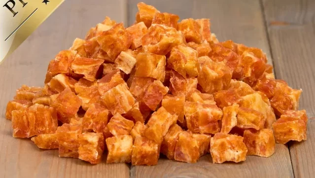 Getrocknete Hühnerbrusthappen mit Fisch sind für jeden Hund als Leckerli für zwischendurch oder auch beim Training als Belohnung optimal. Sie sind besonders fettarm und selbst Hunde, die zu Übergewicht neigen, müssen nicht auf diesen Gaumenschmaus verzichten. Hühnerbrust ist äußerst gut verträglich und wird auch von Hunden mit Nahrungsmittelunverträglichkeiten und Allergien gut vertragen.